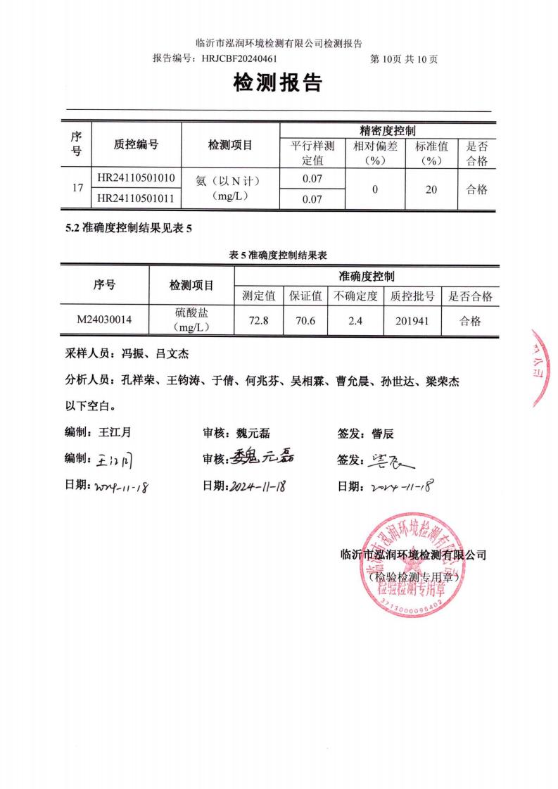 2024年11月出厂水水质检测报告(临沂市水务集团)