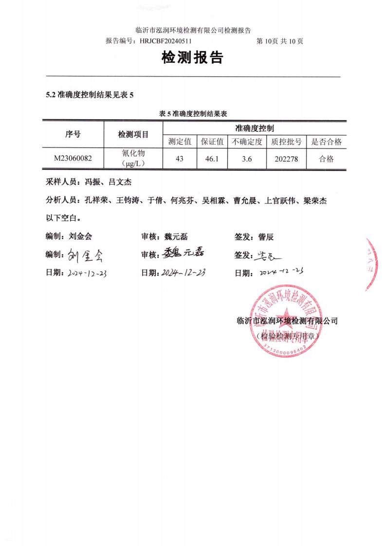 2024年12月出厂水水质检测报告(临沂市水务集团)