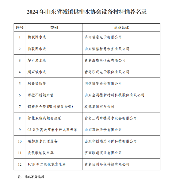 2024年山东省城镇供排水协会设备材料推荐名录