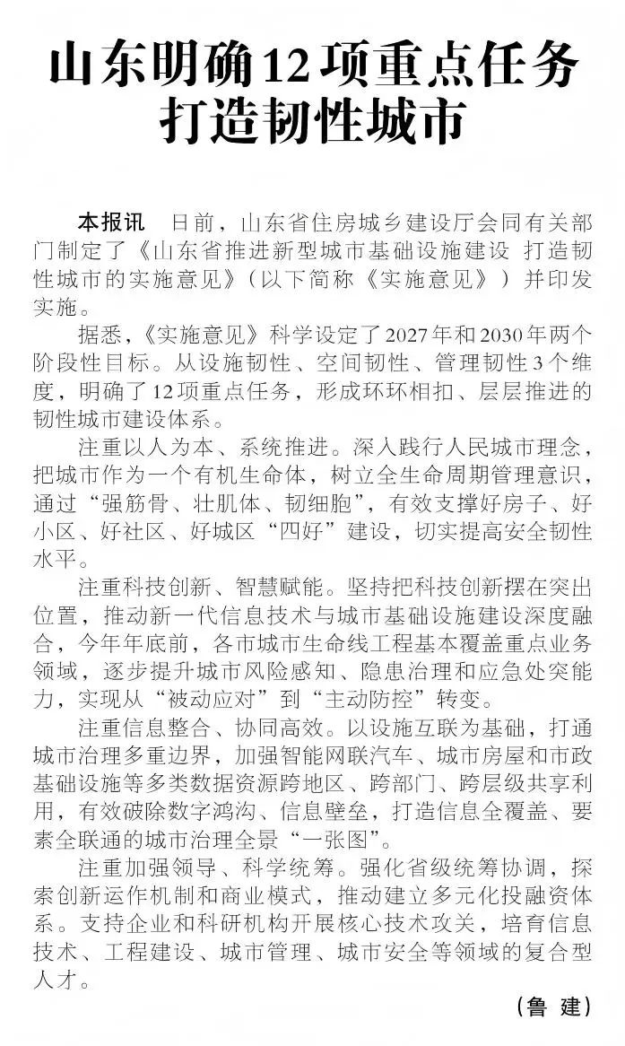 日前,山东省住房和城乡建设厅会同有关部门制定了《山东省推进新型城市基础设施建设打造韧性城市的实施意见》(以下简称《实施意见》)并印发实施。