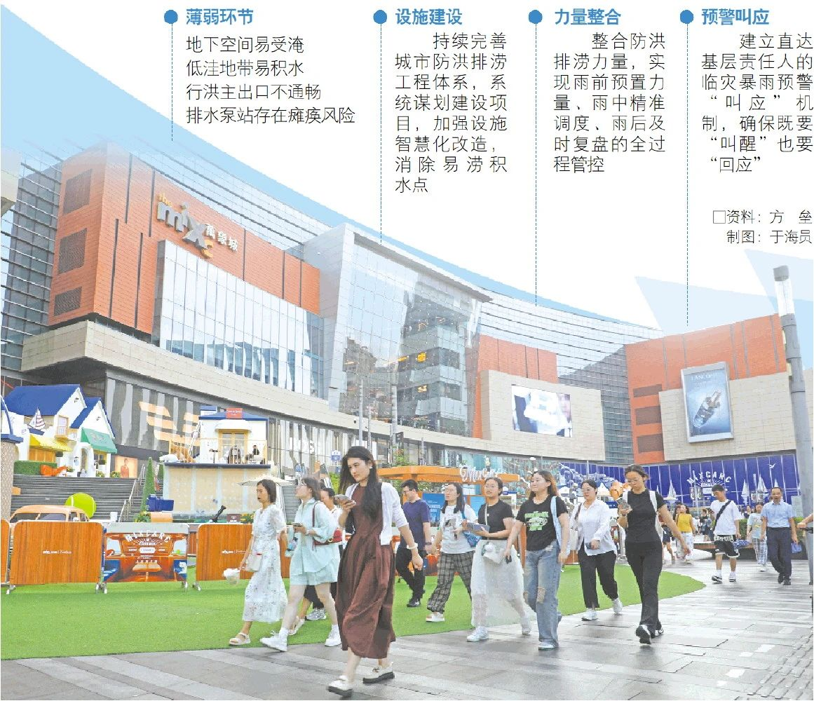 当日凌晨,一场急雨倾泻而下,当班工作人员在停车场出入口及时铺设了沙袋。记者看到,中午时分,马路路面还有些湿润,但商场停车场出入口的地面则较为干爽。“依托于商场建设初期的设计,我们日常工作量减轻了很多。”刘轩硕说。