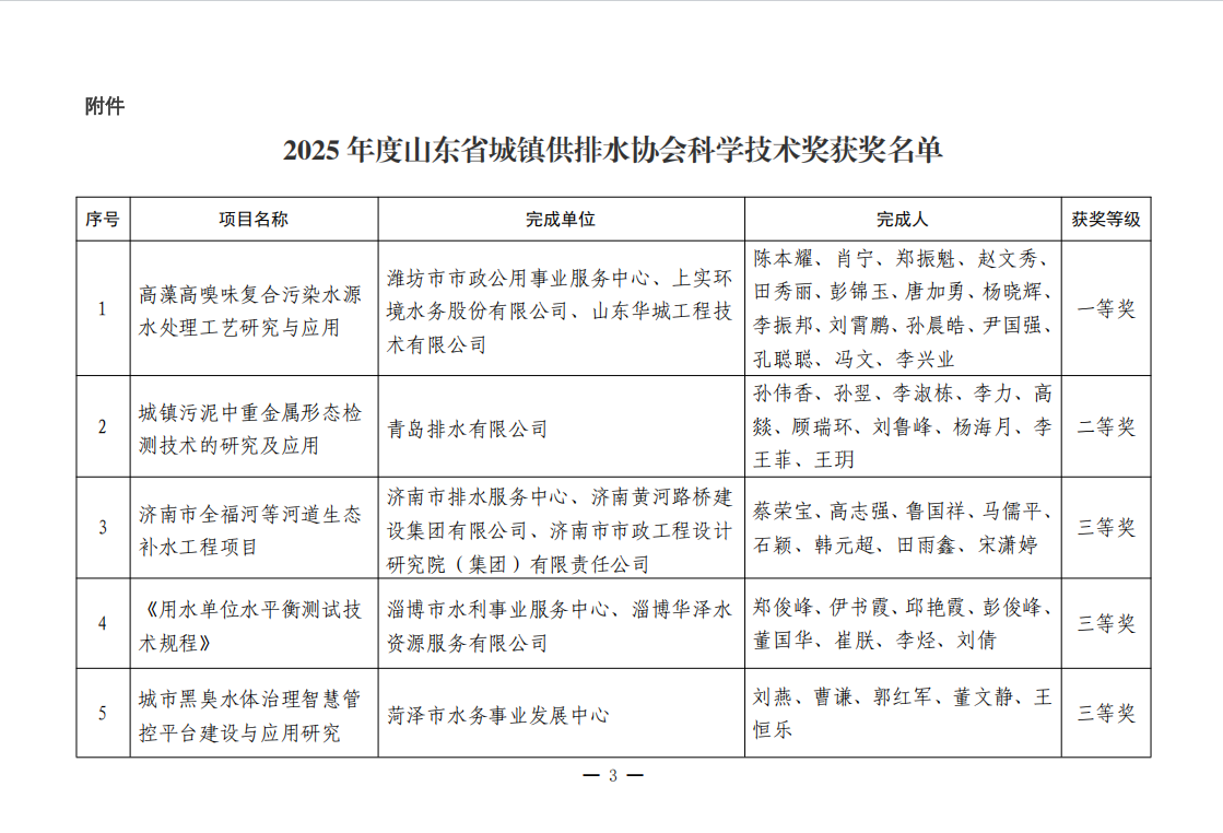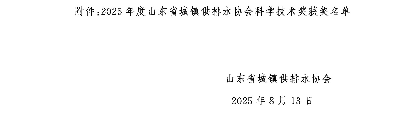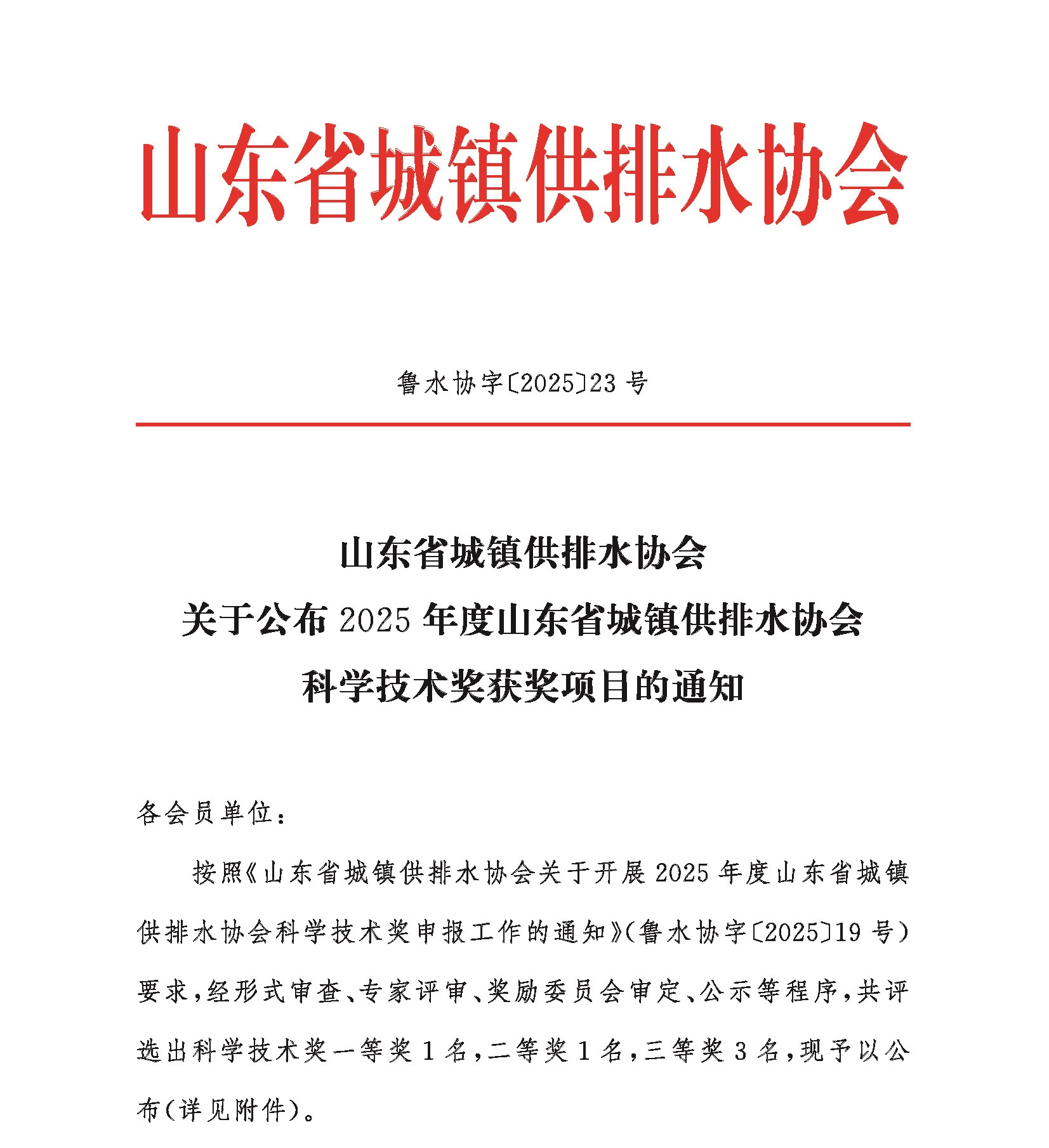 按照《山东省城镇供排水协会关于开展2025年度山东省城镇供排水协会科学技术奖申报工作的通知》(鲁水协字〔2025〕19号)要求,经形式审查、专家评审、公示等评审程序,2025年度山东省城镇供排水协会科学技术奖获奖项目揭晓。根据《关于2025年度中国城镇供水排水协会科学技术奖申报工作的通知》(中水协〔2025〕17号),协会将按要求将获奖项目推荐至中国水协。