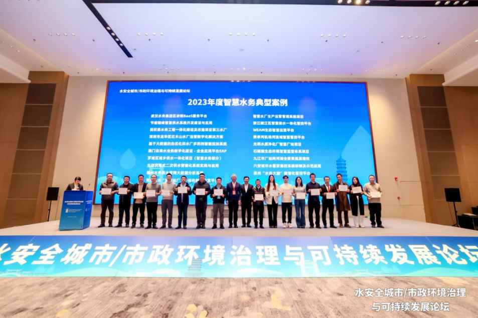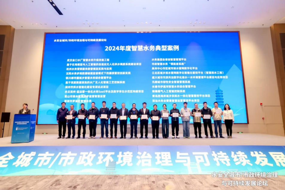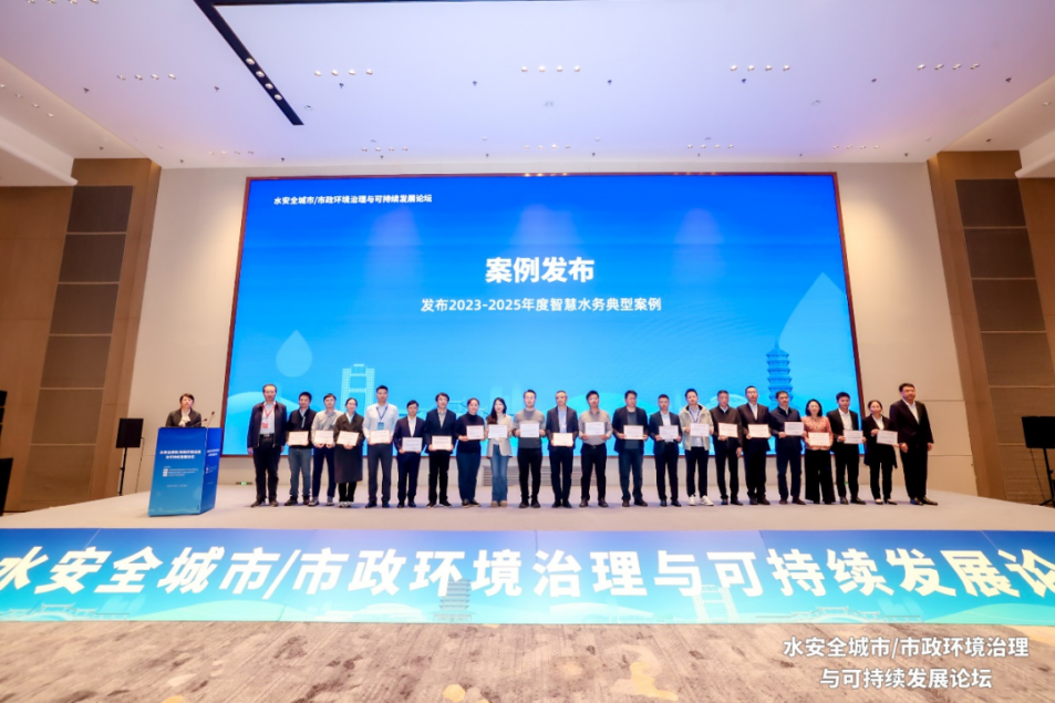 张峰总工程师、王昊副市长、陈波平总监、刘伟部长、何智勇局长、吴凡松主任共同向入选2023年度、2024年度、2025年度“智慧水务典型案例”的单位颁发了证书。