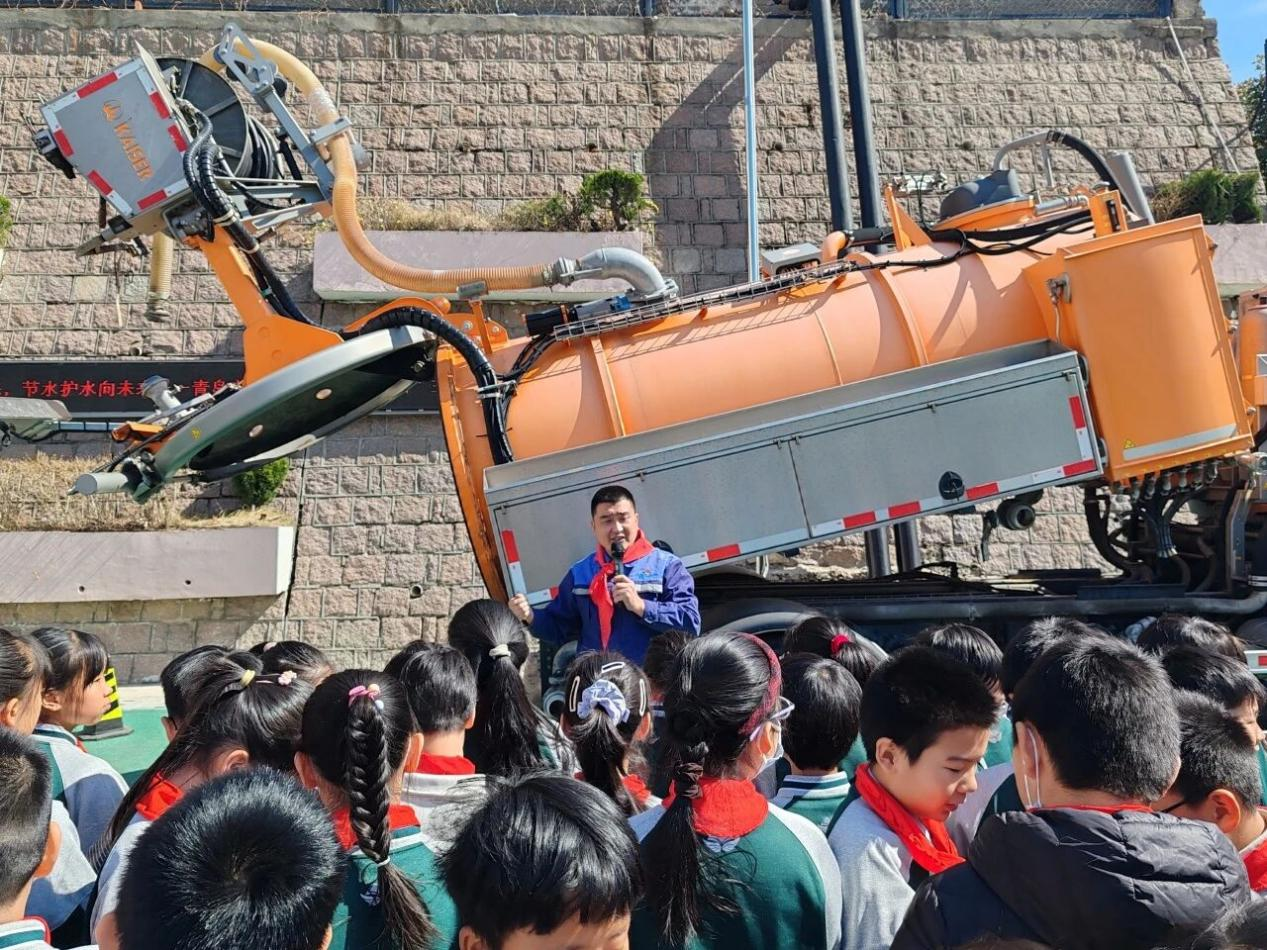 户外实景实操环节,向孩子们细致讲解凯撒联合疏通车的工作原理、操作流程,耐心解答大家提出的各类疑问,并邀请学生们近距离观察、亲手体验疏通车操作,让孩子们亲身感受排水作业的细节与不易。