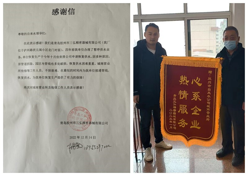 “谢谢自来水公司的工作人员热情周到的服务,为我们公司排忧解难。”1月29日,青岛三弘精密器械有限公司工作人员将一面印有“心系企业,热情服务”的锦旗送到青岛胶州自来水有限公司城南营业所工作人员手中,感谢自来水公司工作人员有责任、有担当,把工作落到实处,为企业发展提供了帮助。
