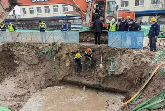 “长江路与长沙路交叉口供水管道被施工损坏。”接到信息反馈后,菏泽市水务集团自来水有限公司在菏泽市水务集团副总经理冯江华的部署下,因疫情防控组建的应急专班立即启动应急预案,公司副总经理赵永安、李健带队赶赴现场,展开紧急抢修。