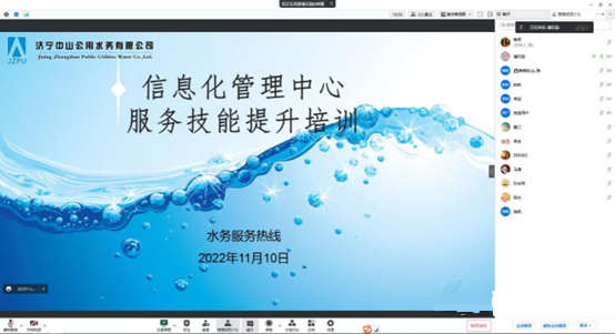 为进一步提升供水热线服务水平,增强优质服务意识,助力优化营商环境工作,济宁中山公用水务有限公司信息化管理中心按照疫情防控工作要求,采取“线上会议”模式,组织水务热线全体员工开展服务技能提升培训会。