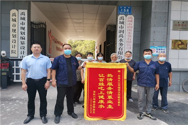 9月13日上午,车队小区居民将印有“热情服务情系业主,让百姓吃上健康水”的锦旗送到禹城市润禹水务有限公司,感谢禹城市润禹水务有限公司安装队高效改造车队小区供水管道,为其解决饮水问题。该小区六号楼居民孙阿姨激动地说:“我们小区是20多年的老管道,经常漏水,水质二次污染、压力小等问题一直困扰着我们,这次改造为我们新铺了供水管道,工作人员们加班加点、不辞辛苦,饭都顾不上吃,让我们太感动了,润禹水务真是好样的”。
