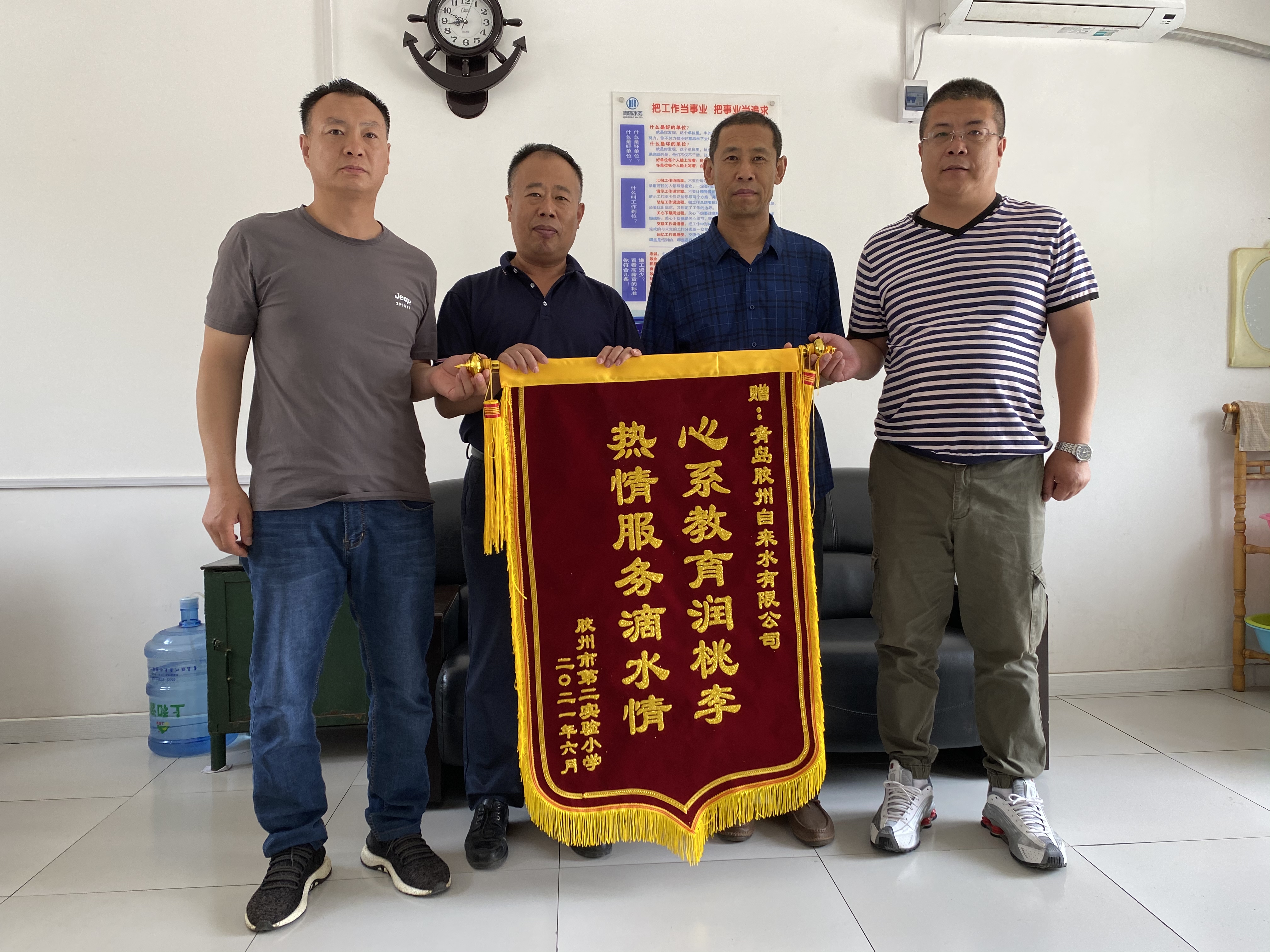近日,胶州市第二实验小学薛副校长及办公室赵主任代表全校师生来到青岛胶州自来水有限公司,将一面印有“心系教育润桃李、热情服务滴水情”的锦旗送到青岛胶州自来水有限公司抢修队负责人手中,并感激的说到:“谢谢你们自来水公司,帮助我们学校解决了多年来水压低的老大难问题!”