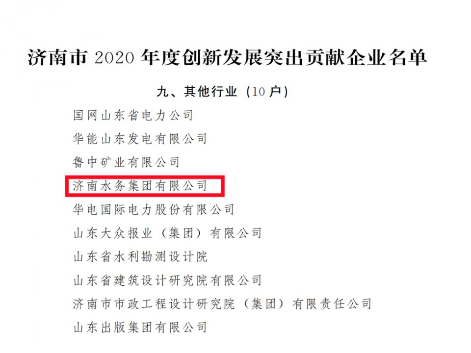 为激励先进,培育典型,激发广大企业创新发展的积极性和主动性,根据济南市鼓励企业创新发展的政策规定,日前济南市政府办公厅发布《济南市人民政府关于表扬2020年度创新发展突出贡献企业的通报》,济南水务集团有限公司被评为济南市2020年度创新发展突出贡献企业。