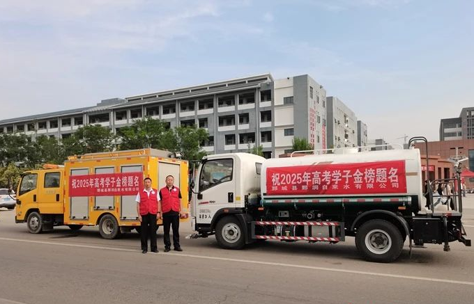 2025年高考期间,鄄城县鄄润自来水有限公司为保障考场用水安全,在高考考点设置爱心送水车、应急工程车,全力应对突发用水情况,以实际行动为考生和考务人员保驾护航。
