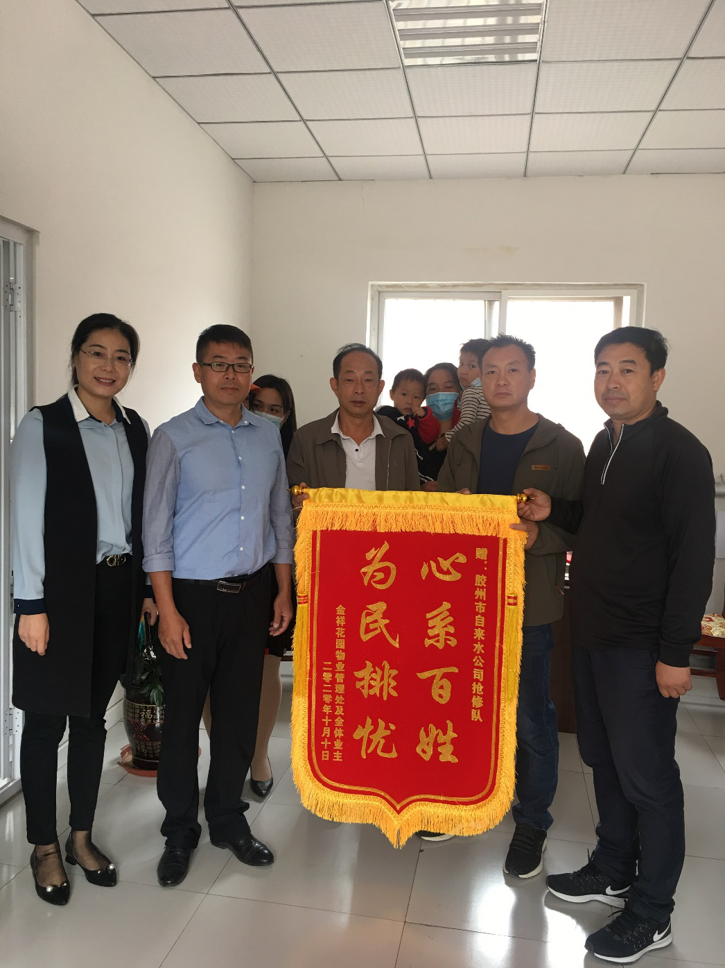 近日,胶州市福州北路金祥花园小区物业吴经理及小区业主代表一行5人来到青岛胶州自来水有限公司抢修队,将一面印有“心系百姓,为民排忧”的锦旗送到抢修队负责人手中,以此表达对抢修队的感谢之情。